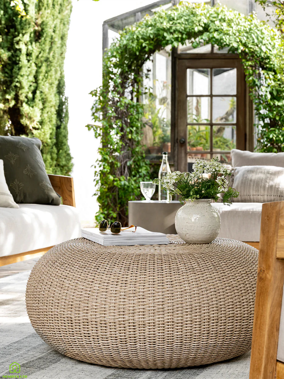 The Kells outdoor coffee table features a sturdy aluminum frame covered in all-weather wicker for a natural look and feel. Rounded corners and a beautiful finish allow this coffee table to blend effortlessly into your outdoor furniture.