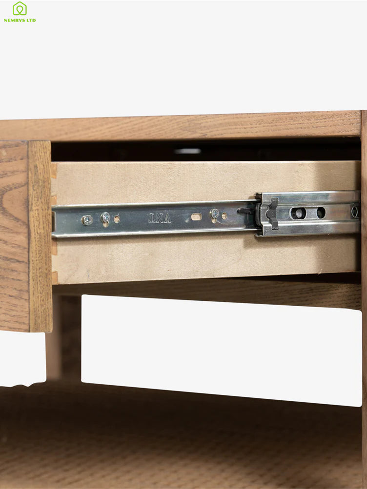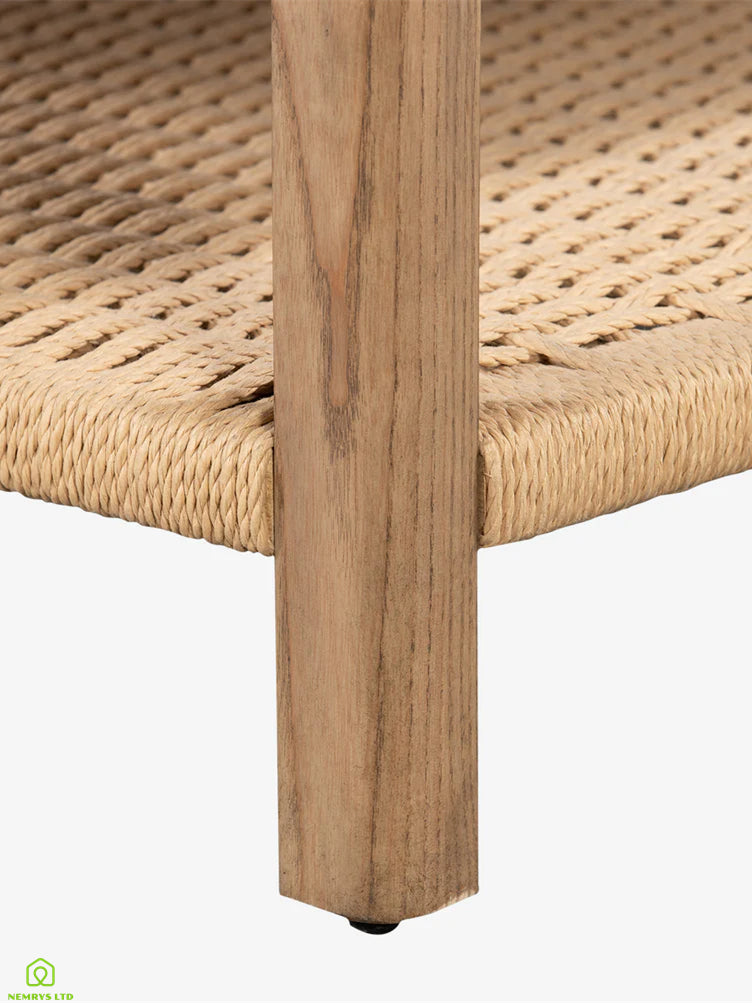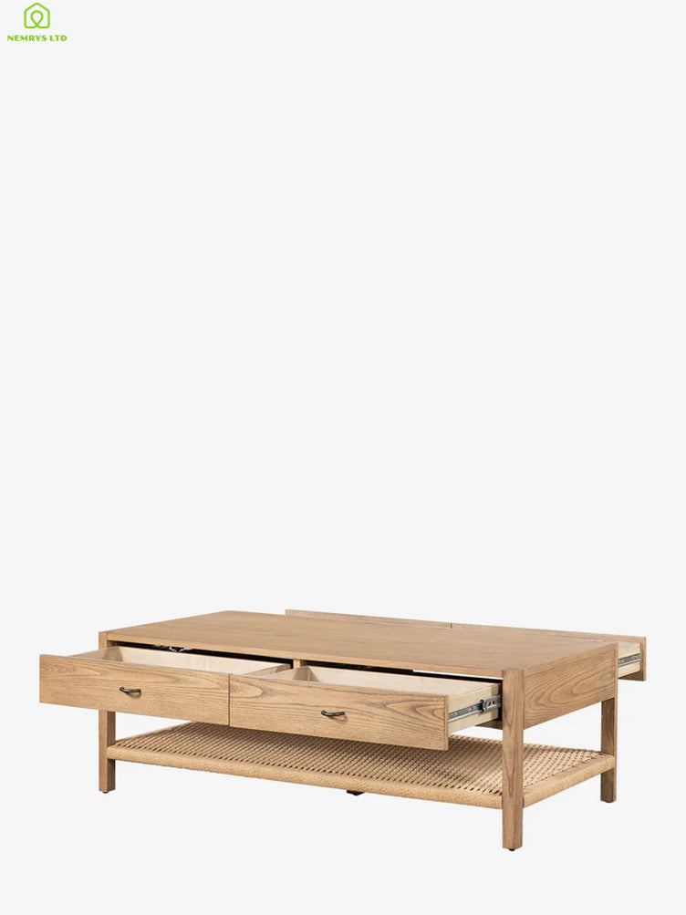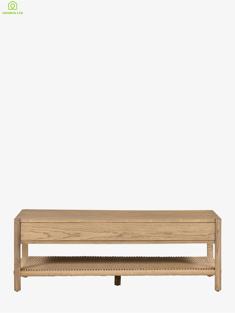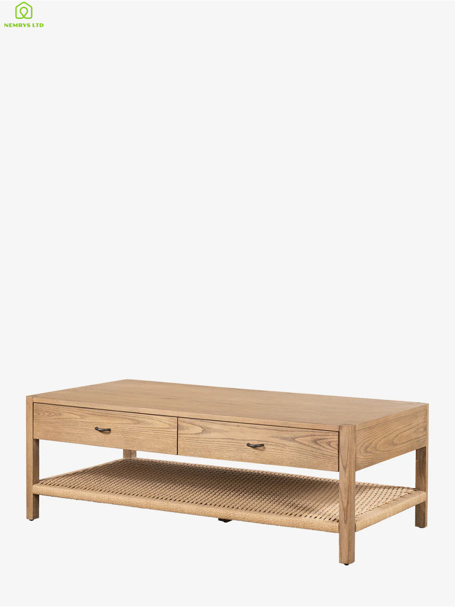 The Lanfield coffee table's wide frame is perfect for displaying decorative items and provides practical storage in your living space. Crafted from solid ash wood, it features two neutral-toned drawers with a vibrant grain and woven paper cord shelves for convenient storage.