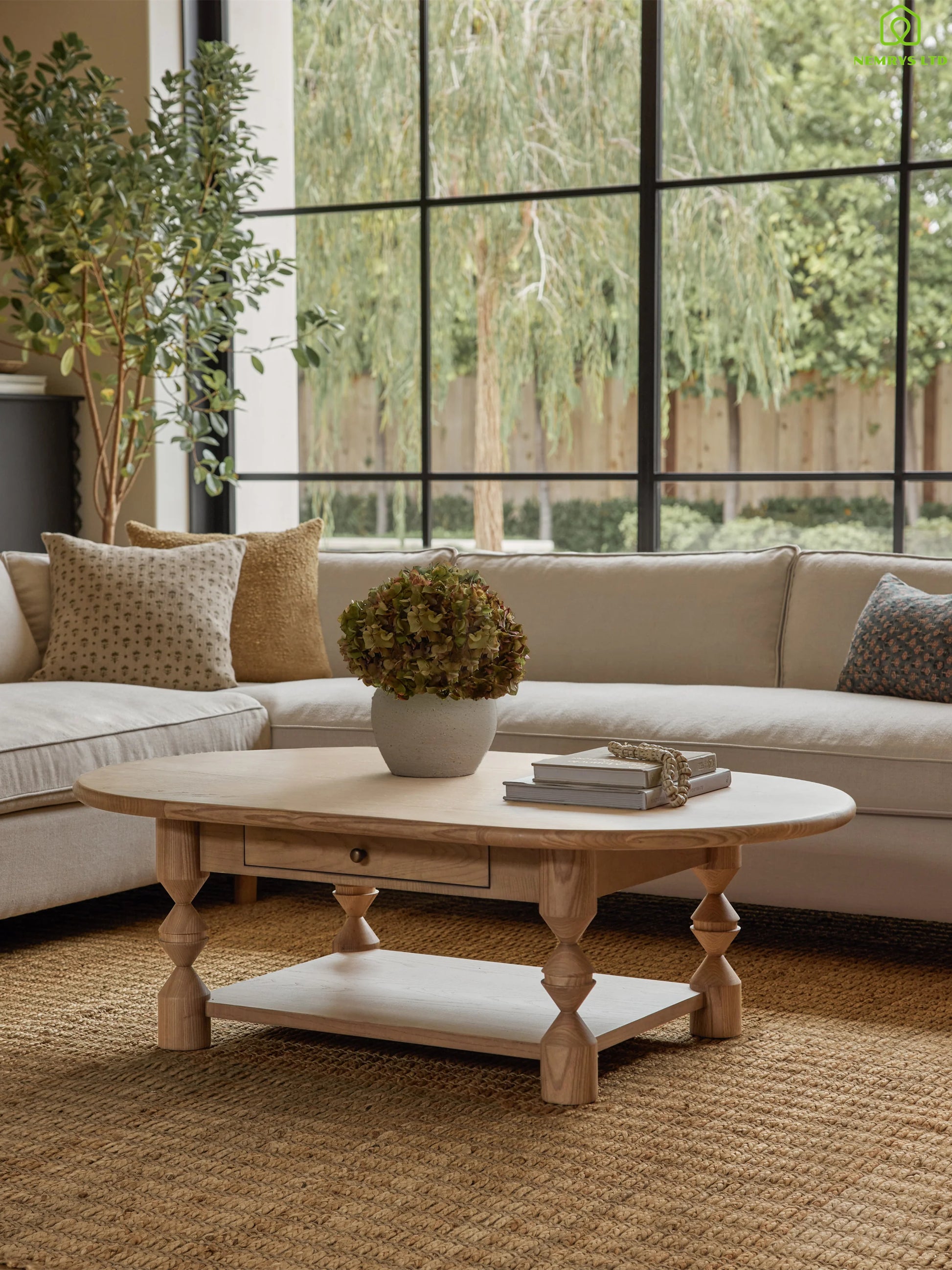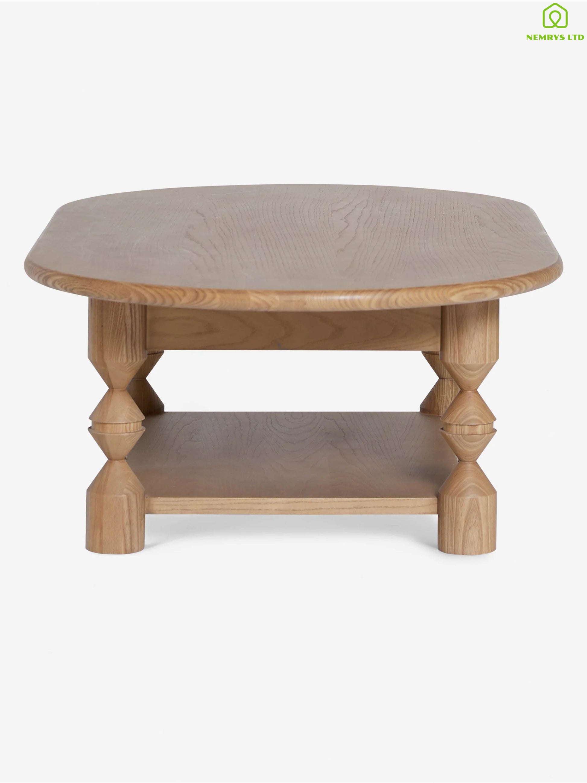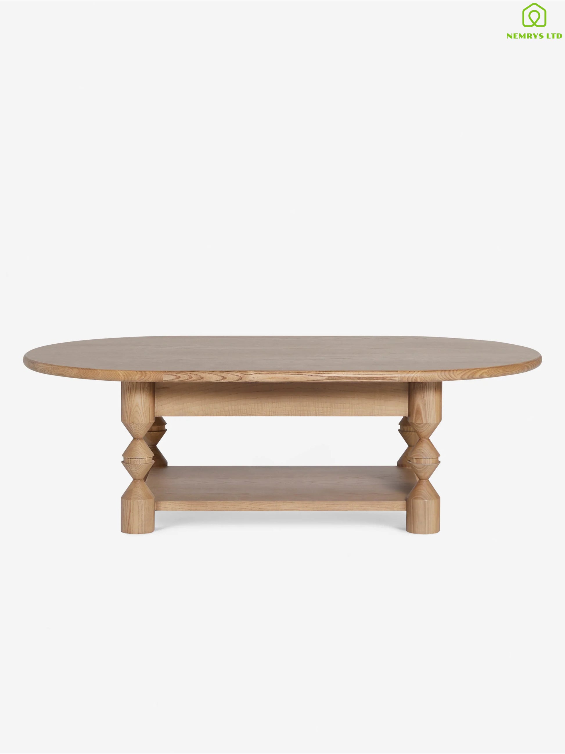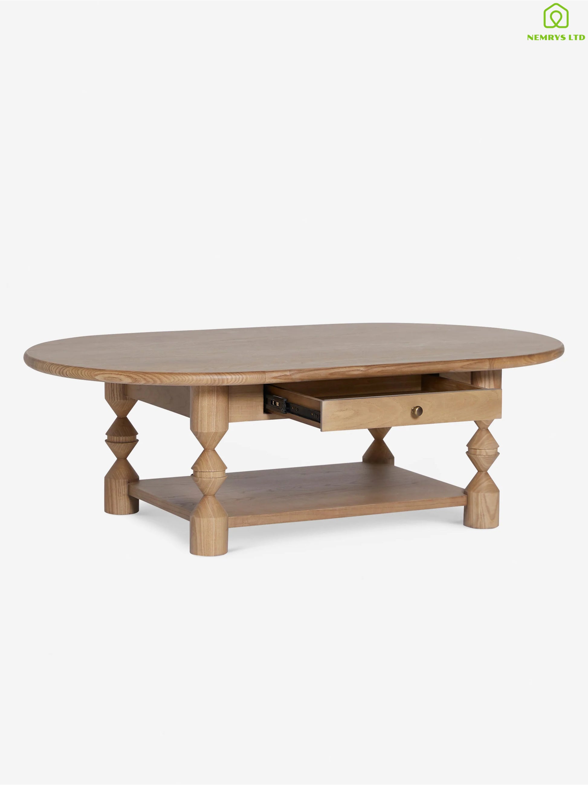 This custom ash wood coffee table is the perfect addition to your living room. Turned legs add a touch of drama to this oval-shaped coffee table, while low-profile drawers and an open lower shelf provide both storage and decorative space.